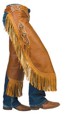 Brown Pull-Up Fashion Chinks with Floral Yoke SetHandcrafted from chrome tanned pull-up leather in rich golden tones with feature details that will turn heads.Pull-Up Fashion Chinks Key Features:floral tooled yoke and scallop setfloral conchos with black accentssewn-on contrasting fringeantique silver umbrella spotsfreedom of movementadjustable leg strapsback buckle closuresfront tie closuresSizes are adult unisex.Size Guide for Weaver Chink Chaps: