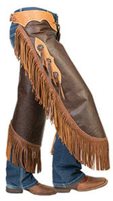 Chocolate Pull-Up Fashion Chinks with Basketweave YokeDetails abound in these premium quality, high fashion chinks. Handcrafted from chocolate chrome tanned pull-up leather, this design features a basketweave tooled yoke and leg scallop set.Pull-up Fashion Chinks Key Features:antique copper berry conchos with tiessewn-on contrasting fringeantique copper umbrella spotsbasketweave tooled yokeleg scallop setfreedom of movementadjustable leg strapsback buckle closuresfront tie closuresSizes are adult unisex.Size Guide for Weaver Chink Chaps: