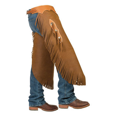 Distressed Brown Chinks with Basketweave Yoke SetConstructed from chrome tanned distressed top grain leather with a great all purpose design.Distressed Brown Chinks Key Features:basketweave tooled yokeleg scallopsdistressed top grain leatherstainless steel conchosfreedom of movementadjustable leg strapsback buckle closuresfront tie closuresSizes are adult unisex.Size Guide for Weaver Chink Chaps: