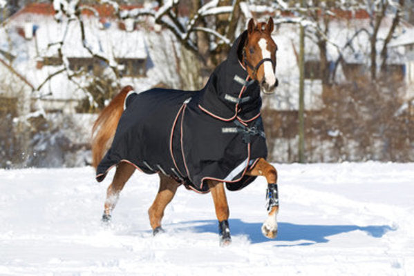 Rambo® Optimo Heavy Weight Turnout Blanket w/ HoodThis Rambo® Optimo Heavy Weight Blanket includes 400 gram liner & 150 gram hood. Made from waterproof and breathable 1000D ballistic nylon: the strongest and most durable turnout material on the market. The lining is anti-static and anti-bacterial with thermobonded fiberfill for longer lasting heat retention. The Rambo® Optimo Turnout Blanket is designed with a split and v-front closure, giving your horse total freedom of movement. Comes standard with leg arches, taped seams, wipe clean tail cord, and an extra large tail flap. Rambo® Optimo Turnout Blanket Features:waterproof & breathableliner systemv-front closuresplit technologystraight surcinglesNote:Detachable hood included (150 gram polyfill)Color: Black with black & orange trim.Sizes range from 66"-87".