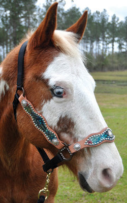 San Saba Rainbow Mystic Scalloped Halter, FullA beautiful, one of a kind halter that is sure to stand out at the rodeo. Scalloped nose and cheeks made out of quality harness leather.Features a multi colored exotic python overlay in a metallic finish. Adorned with silver spots and conchos to finish the look.