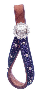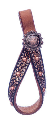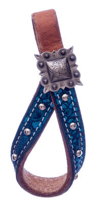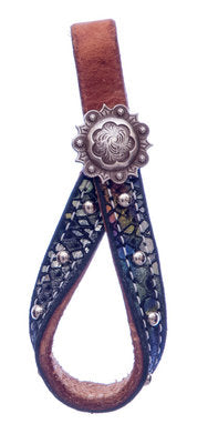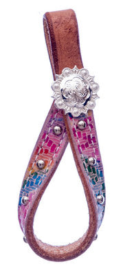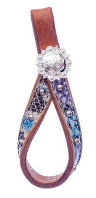San Saba Tie Down KeeperHeavy duty, quality harness leather tie down keepers with beautiful exotic print overlays. Adorned with spots and a concho to easily add to any breast collar.