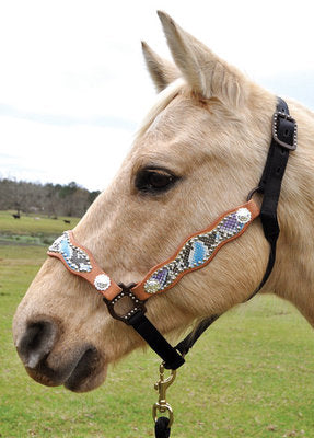 San Saba Tropical Python Scalloped Halter, FullA beautiful, one of a kind halter that is sure to stand out at the rodeo. Scalloped nose and cheeks made out of quality harness leather.Features an exotic purple and turquoise python screen print overlay. Adorned with silver spots and conchos to finish the look.