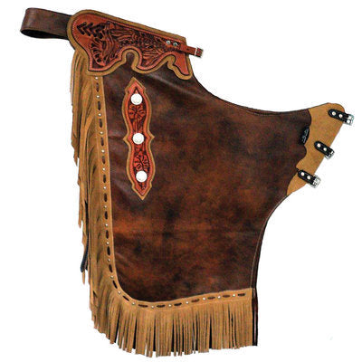 Show Stopper Chinks - LiquorAs the name implies, these chinks are Show Stoppers! Made from a 3½ oz Liquor colored leather with hand tooled tops and billets. Adorned with spots and lacing down the fringe.Available in: small (31" outseam), medium (33" outseam) or large (35" outseam).Waist adjusts from 32" - 38".