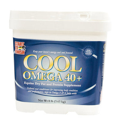 Cool Omega 40+™, 8 lbEquine Dry Fat & Protein SupplementA cool source of energy that helps to maintain and improve hair coat, body condition, and performance. 40% minimum Crude FatKey Benefits of Cool Omega 40+™:contains vegetable fat for daily performance and weight gaincontains flaxseed, a source of Omega 3 fatty acidseasy-to-use pelleted product; no liquid spills or lingering messblended calories and proteins improve hair coat and over-all body conditionhighly palatable and digestible so product is consumed and well utilized; less wasteflexible feeding options; ideal as a top dressing, in grain mixes, or pelletsconvenient for small scale top dressingMixing and Feeding Instructions:Feed at a rate of 2 oz per day for an increased improvement in body condition, feed at a rate of 4 oz per day mixed with the grain portion of the diet. Horses with high activity levels or heavily stressed can be fed up to 8 oz per day.Enclosed measuring cup holds approximately 4 oz of Cool Omega 40+™.Check cup quantity periodically. Measuring scoop included.View manufacturer and/or label information