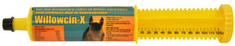 Willowcin-XWillowcin-X, by Finish Line, is a fast acting pain reliever that temporarily relieves minor soreness and stiffness due to overexertion. It's also more gentle than aspirin on the stomach and safer than bute.Some pain medications may cause decreased blood flow to areas such as kidneys and intestines, which may result in kidney problems. As a result, most NSAIDs are not recommended for periods of use longer than two to three days. Willowcin-X is safe for daily use.Ingredients: methylsulfonylmethane, white willow, devils claw, kava kava, yucca, chamomile, feverfew, turmeric, boswellia serrata, and antioxidant blend of grape seed.Dosing Instructions: Give 2 ounces (one dose) orally and then give the remaining 2 ounces two hours later. May be given before or during feeding. Do not exceed one syringe (two doses) per day.Veterinarian tested and recommended!