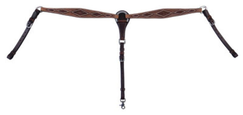 Cody Pro Diamond Tooled Breast CollarThe Cody Pro Diamond Tooled Breast Collar features diamond shaped chest straps and two-tone diamond tooling. The perimeter of the diamond tooling is highlighted with stainless steel dots. Both up tugs have stainless steel buckles.