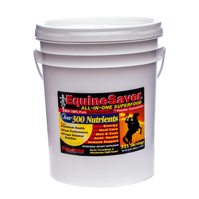 EquineSaver® All-In-One SuperfoodA comprehensive all-in-one super food! Contains over 300 nutrients for overall health and joint support. EquineSaver® All-In-One Superfood helps:improve skin and coatpromote muscle volume and strengthincrease stamina and endurancemaintain electrolyte balancestrengthen immune systemimprove circulationpromote hoof growthstrengthen joints and much moreView manufacturer and/or label information