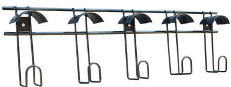 Half Moon Bridle RackThe Half Moon Bridle Rack is made from heavy gauge metal and mounts to the wall with screws. The 5 half-moon shaped hangers safely hold your bridles while preventing any creases in the crown piece. The 5 tack hooks conveniently stores reins, leads or lunge lines.Measurements: 32" long and 9" wide